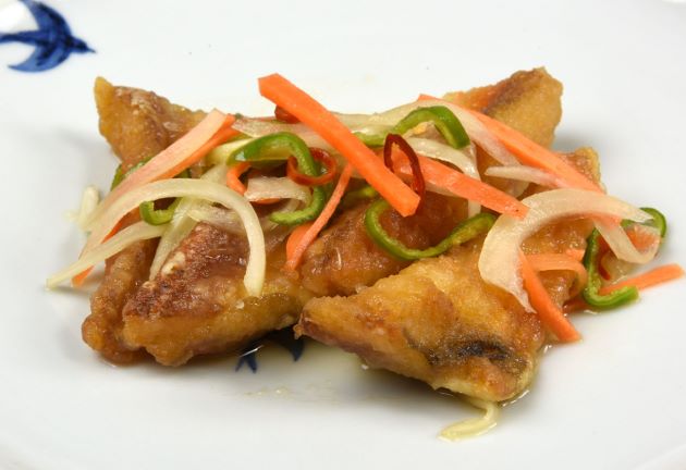 カナガシラのエスカベーシュ 小振りなものを使う。水洗いして三枚に下ろす。水分をよくきり、片栗粉もしくはコーンスターチをまぶしてじっくりと二度揚げをする。これを合わせ酢(白ワインビネガーと市販のハーブブイヨン、砂糖、少量の白ワインなどを合わせて一煮立ちさせる)につけ込む。にんじん、ピーマン、玉ねぎなどとからめて数時間から1日馴染ませる。クリックで閉じます![]()