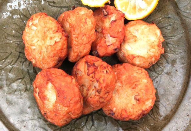 三枚に下ろして身をスプーンなどでかき取りすり身にして、塩、砂糖、みりんなどで味つけして揚げたもの。今回は玉ねぎを加えて見たが、甘味が出て実においしい。カレー粉を加えてだんご状にして揚げても別種の味がする。