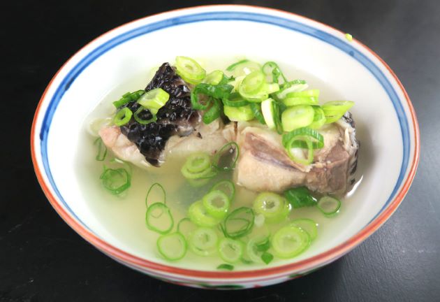 クロムツの潮汁 中骨つきの尾に近い部分の身や、腹骨周りの身を汁多目で煮て塩味をつけたもの。あっさりとした塩味で身はほろほろと柔らかい。汁が絶品である。クリックで閉じます![]()