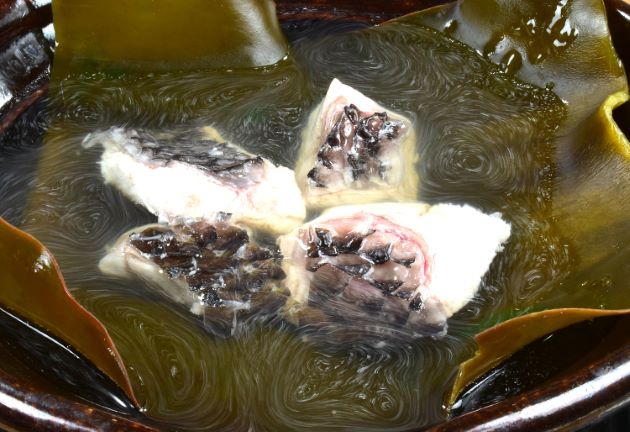 水洗いして三枚に下ろす。食べやすい大きさに切り、軽く湯通しして冷水に落とす。表面のぬめりを流し、水分を切る。これを濃厚な昆布だし、酒・塩の中で温めながら食べる。