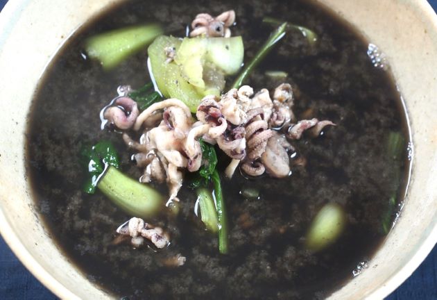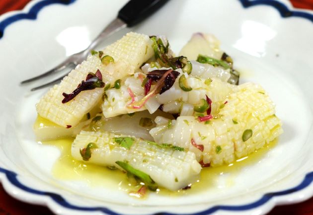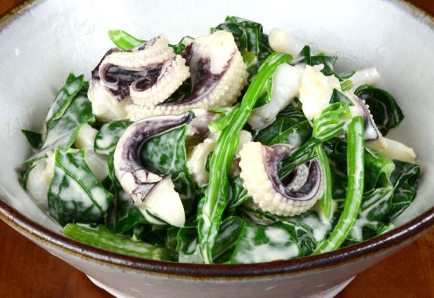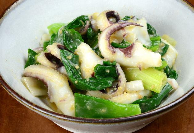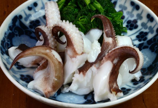 成イカコウイカのぬた(スミイカのぬた) げそを使ったが、どこを使ってもいいし、小さなものなら丸ごと使ってもいい。げそは塩をまぶしてぬめりを取り、塩水で硬くならない程度にゆでて氷水に落とす。水分をよくきり、時期の野菜などと辛子酢みそで和える。酒の肴として最高である。