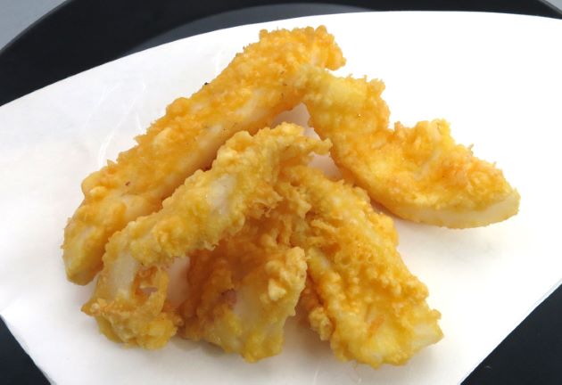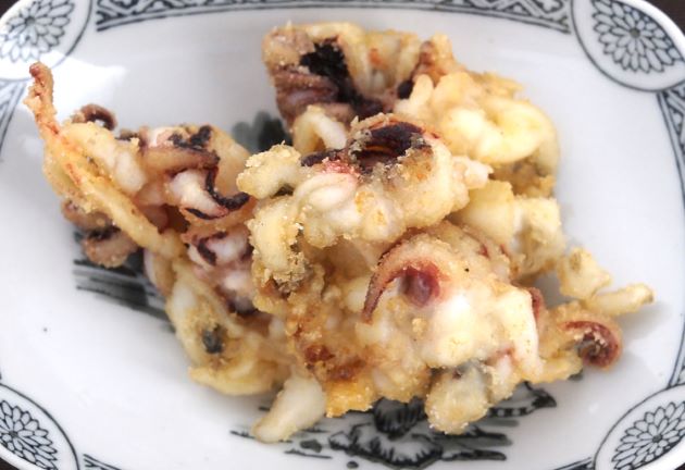 成イカコウイカの天ぷら(スミイカの天ぷら) 江戸前天ぷらの代表的な種のひとつ。高温でできるだけ短時間で揚げるのがコツ。水洗いして皮を向く、表面に切れ目を入れて、水分をよくふきとり、小麦粉をまぶす。衣をつけて揚げる。衣の香ばしさに相反して中はほとんど生という感じがいちばんうまいと思う。揚げすぎると硬くなる。