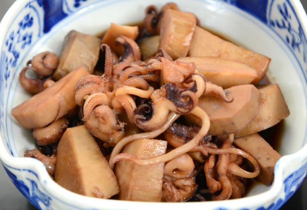 新イカコウイカの煮もの(新イカの煮もの) げそは野菜と煮て美味である。ここでは秋の小振りのもののげそと、これまた秋に出始めた土垂(サトイモ)を煮たもの。イカの甘さとサトイモの癒やし系の甘さがあいまってとてもおいしい。