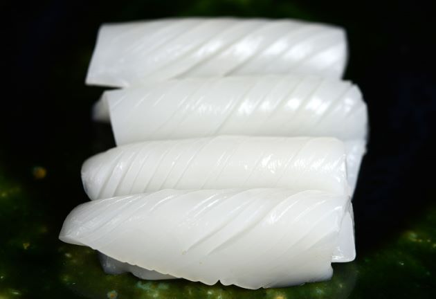 成イカコウイカの刺身(スミイカの刺身) 新イカが持てはやされる関東ではあるが、真の意味でのコウイカの味は成イカになってから、だ。墨をつぶさないように甲、内臓を取り去る。できるだけ手早く汚れを取り、以後絶対に水で洗わないようにする。皮を向き切れ目を入れて刺身にする。ねっとりとして呈味成分からくる甘味が強い。