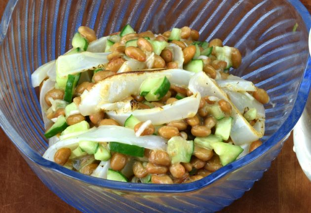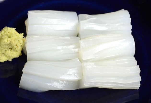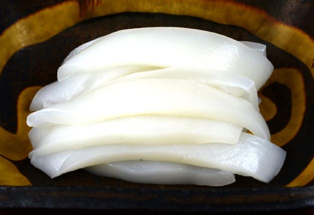 産卵期のものなど比較的安いのでいろいろ工夫して造るといい。ここでは水洗いして厚みのある皮を剥き、外套膜(胴の部分)の表側をあぶって薄く切り取る。これを納豆と和える。単にわさび醤油で食べてもいいが、納豆と和えると佳肴にもなる。