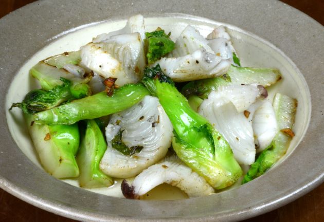 成イカコウイカの中華炒め(スミイカの中華炒め) もっとも美味しい食べ方のひとつが炒めものだと思っている。ここでは塩味にしたが、しょうゆ(中国醤油)味にしてもいい。野菜はつぼみ菜を使ったがお好みで。ニンニク・ショウガ風味をつけた油でいためて野菜を加えて、海鮮味と塩を酒で合わせたもので味つけ、粒コショウを振る。