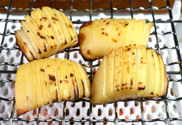 成イカコウイカの網焼き(スミイカの網焼き) 刺身になる程度に鮮度のいいものを水洗いして表側だけの皮を剥く。酒・醤油に30分ほどつけて網の上で焼き上げる。仲間で火を通さないで、中は刺身という感じで火を通す。