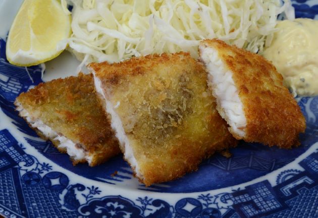 コショウダイのフライ あまり新しいものよりも、寝かせたものの方がおいしい。三枚に下ろし血合い骨・腹骨を取る。塩胡椒して小麦粉をまぶし、衣(小麦粉・卵・水・油。溶き卵でもいい)をからめパン粉をつけてかりっと揚げる。脂のある時季のものは柔らかく豊潤。その上、上品な味わいで美味。クリックで閉じます![]()
