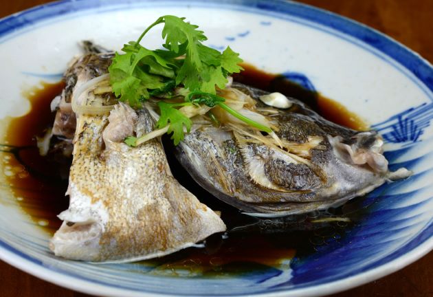 コショウダイの蒸魚(清蒸) 水洗いして二枚に下ろす。頭部でも切り身でもいいが、ここでは頭部(兜)を使った。皿に盛りてしょうが、ねぎを乗せて15分ほど蒸す。蒸し上がりにタレ(醤油・紹興酒・砂糖・魚醬を合わせて一煮立ちしたもの。もしくは甘い中華醤油)をかけ、ねぎ、香菜などをかざり、熱く熱した油をかける。クリックで閉じます![]()
