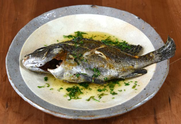コショウダイのバター焼き 小型は丸のまま、大型は切り身を使う。水洗いして表面の水分をていねいに取る。塩コショウして1時間ほど寝かせる。フライパンに多めの油をいれてじっくり香ばしくソテーする。火が通ったら、マーガリン(バター)で風味づけする。身離れがよく、皮目に独特の好ましい風味がある。とてもご飯に合う。クリックで閉じます![]()