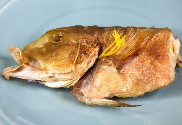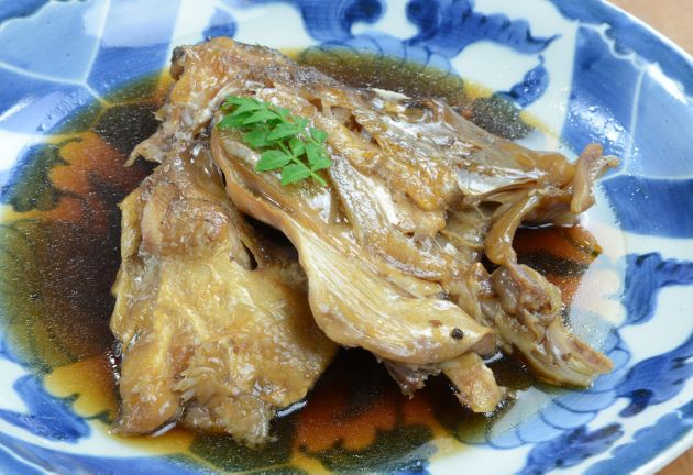 シロアマダイの煮つけ(白川の煮つけ) 大型個体の鱗をすき引きして水洗い。ここでは頭部を梨子割りにする。切り身は湯通しして冷水に落としてぬめりや血液などを流す。水分をよくきり、酒・砂糖・しょうゆで煮つける。脂がのった個体の皮目はとろけるようになり、そこだけでも甘みうま味がある。食べ尽くした後は骨湯に。クリックで閉じます![]()