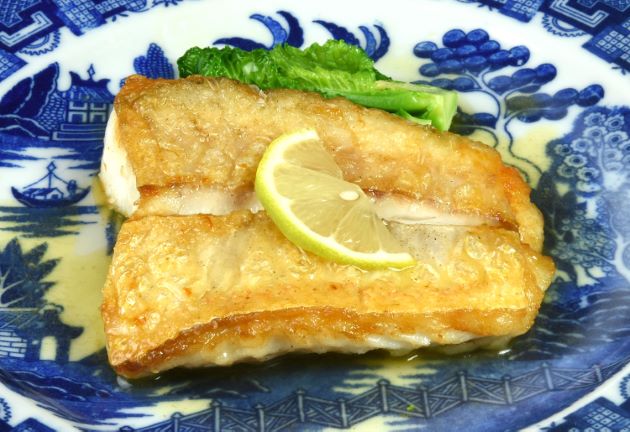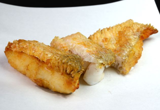シロアマダイの天ぷら 鱗を引かないで水洗いする。三枚に下ろして腹骨・血合い骨を取る。切り身にして小麦粉を身と切りつけた断面にまぶす。衣を皮につけないよう注意して皮を上にして揚げる。油を皮目にかけながら揚げる。表面は硬くサクッと香ばしい。中は柔らかくしっとりとして甘味がある。クリックで閉じます![]()