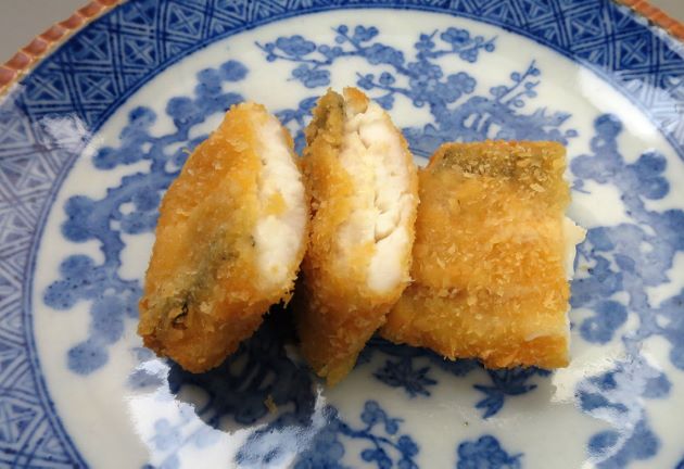 シロアマダイのフライ(白川のフライ) 小振りのものは比較的安いのでフライにしても美味。鱗を引き、三枚に下ろして腹骨・血合い骨を取る。塩コショウして小麦粉をまぶし、衣(小麦粉・卵・少量の水・少量の油を合わせたもの)をくぐらせパン粉をつけて揚げる。適度に繊維質の身の層にうま味豊かな肉汁が満ちて、とてもうまい。クリックで閉じます![]()