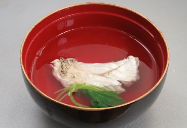 シロアマダイの吸物(白川の吸物) 潮汁以上に身質の良し悪しが問われるのが吸物である。切り身に振り塩をして出て来た水分をよく拭き取る。吸い地(カツオ節出し・酒・塩)に切り身をくぐらせて陸揚げしておく、身が落ち着いたら、新しい吸い地に落とす。吸い地とともに口の中でふんわりとほぐれるそが実に官能的。クリックで閉じます![]()