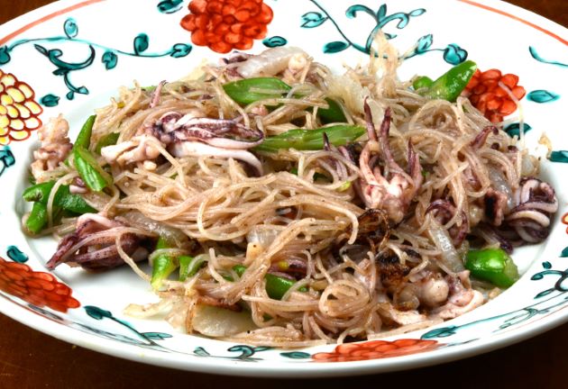 ジンドウイカの焼きビーフン 水洗いして胴とげそを分ける。今回はげそのみ使用するがよく水分をきる。 玉ねぎ、インゲンなど野菜を切る。ビーフンは沸騰した鍋にコップいっぱいの水を加えたものの中で3分(製品によって違う)。水分をよくきる。パンにショウガ・にんにくみじん切りと太白ごま油を加えて熱し、げそ、野菜、ビーフンの順に入れていく。紹興酒、塩コショウ、ハイミーで味つけする。クリックで閉じます![]()