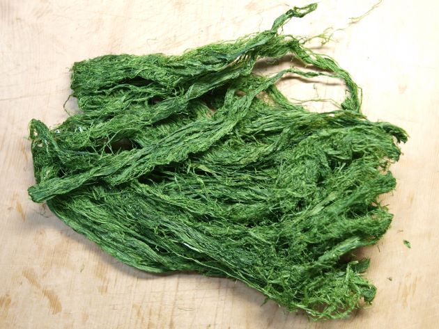 スジアオノリの天ぷら 採取したスジアオノリ、買ったものなどは流水などで洗う。水分を絞り、小麦粉をまぶして薄い衣で高温で短時間揚げる。さくっと香ばしい中にアオノリ特有の香りが強く立つ。非常にうまい。