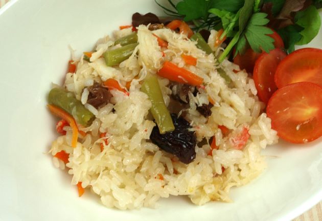 ズワイガニのピラフ 冷凍カニや剥き身を使う。米を普通に洗い、オリーブオイル、ハーブブイヨン(クールブイヨン)、塩、粒コショウ、ローレル、カニの身で炊き込む。カニの甘さとハーブの香りがきいてとてもおいしい。クリックで閉じます![]()