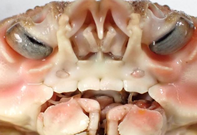 雄 甲長12cm・甲幅10cm前後になる。甲が小さく極端に脚が長い。丸みを帯びた正三角形。口の上部には4歯があり直線上に並ぶ。