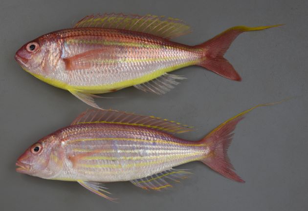 25cm SL 前後になる。側扁し、下あご近くから腹側、尾に向かって黄色い帯が2本走る。腹面は明るい黄色の帯のように見える。尾鰭上葉は糸状に伸びる。頭部の真後ろ肩に思える部分に赤い斑紋がない。[17cm・128g]
