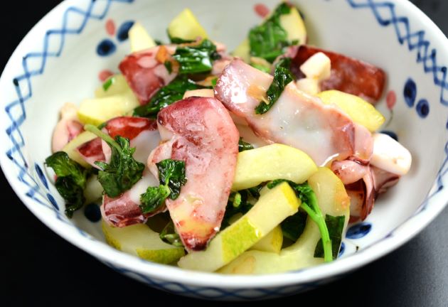 ソデイカの湯引き(アカイカの湯引き) 国産、兵庫県日本海側で揚がったものの冷凍ブロックを切りつけたもの。冷凍ブロックは解凍したら表面の水分をていねいに拭き取る。適当な大きさに切って塩水の中で湯通しし、氷水に落として粗熱を取る。水分をよくきり刺身状に切る。やや長めに熱を通しても中心部分は生の状態である。熱が通った部分の味わいと完全に生の部分の対比がいい。クリックで閉じます![]()