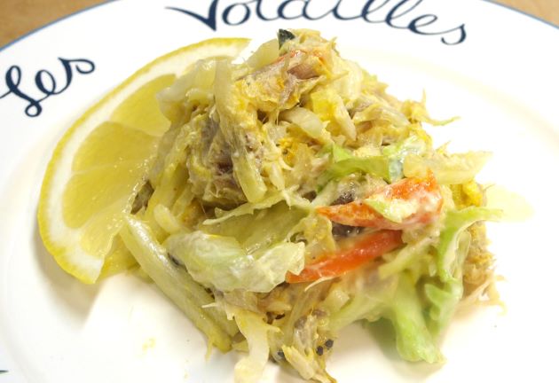 タイセイヨウサバのサラダ 塩さば、干ものなどを焼き、骨を除きながらほぐす。マヨネーズをベースにチリパウダー、カレー粉などを加えて和える。玉ネギ、レタス、ニンジン、リンゴなどと合わせてサラダにして美味。ポテトサラダに加えてもいい。クリックで閉じます![]()