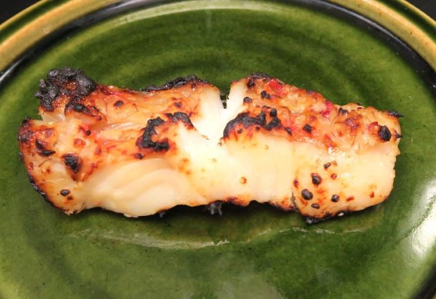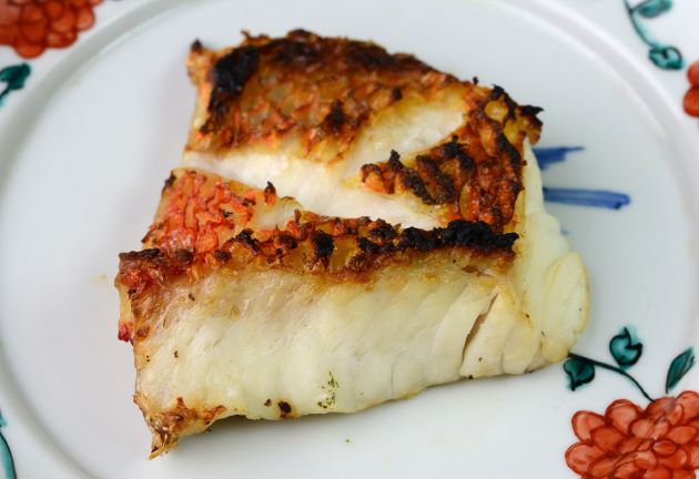 タキベラのみそ漬け(西京焼き) 水洗いして三枚に下ろし、切り身にする。水分をよくきり、振り塩をして水分が出て来たら拭き取る。これを白みそ・みりん・酒をねった地に1日以上つけ込む。みその塩分濃度によって漬け込む時間を変える。こがさないようにじっくり焼き上げる。くせのない白身で皮目に味がある。これをみそが引き出してとても味わい深い。