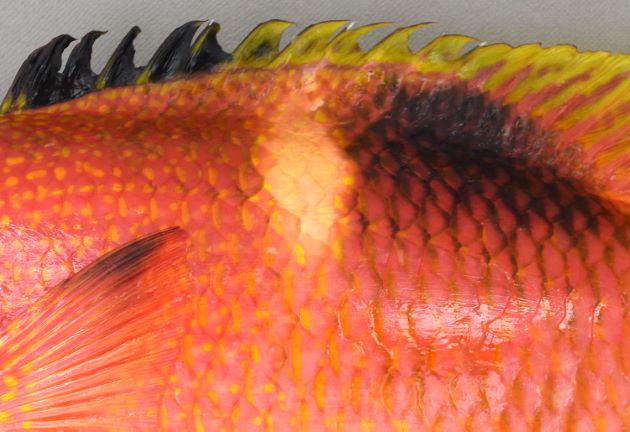 体長80cm前後になる。頭部と体側前半にゴマ状の黄色い斑紋が散らばる。背びれ前半は黒く、後半は赤い。尾鰭は湾入し後部上部と下部は長くのびる。尾鰭は湾入する。小型は中上背の部分にある黄色い帯がはっきりと見え黒い斑紋がある。[雌 34cm SL ・1.054kg]体長80cm前後になる。頭部と体側前半にゴマ状の黄色い斑紋が散らばる。背びれ前半は黒く、後半は赤い。尾鰭は湾入し後部上部と下部は長くのびる。尾鰭は湾入する。小型は中上背の部分にある黄色い帯がはっきりと見え黒い斑紋がある。[雄 40cm SL ・1.978kg]体長80cm前後になる。頭部と体側前半にゴマ状の黄色い斑紋が散らばる。背びれ前半は黒く、後半は赤い。尾鰭は湾入し後部上部と下部は長くのびる。尾鰭は湾入する。小型は中上背の部分にある黄色い帯がはっきりと見え黒い斑紋がある。[雌 34cm SL ・1.054kg]体長80cm前後になる。頭部と体側前半にゴマ状の黄色い斑紋が散らばる。背びれ前半は黒く、後半は赤い。尾鰭は湾入し後部上部と下部は長くのびる。尾鰭は湾入する。小型は中上背の部分にある黄色い帯がはっきりと見え黒い斑紋がある。[雄 40cm SL ・1.978kg]あまり左右に側へんしない(平たくない)。背鰭下の明るい黄の斑紋は鞍掛状になる。口はあまり大きくなく犬歯がある。口はあまり大きくなく犬歯がある。あまり左右に側へんしない(平たくない)。口はあまり大きくなく犬歯がある。あまり左右に側へんしない(平たくない)。口はあまり大きくなく犬歯がある。あまり左右に側へんしない(平たくない)。