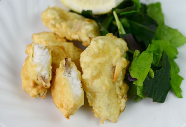 タキベラの沖縄風天ぷら 尾に近い部分が刺身にしてあまった部分を皮付きのまま揚げたもの。適当に切った身に塩コショウする。小麦粉をまぶして、沖縄の天ぷら粉をつけて揚げる。揚げるとふんわりした食感で、ほどよい甘味がある。冷めてもおいしい。