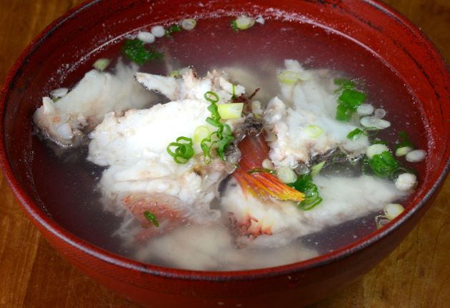 タキベラの潮汁 中骨や刺身で出た皮などを集めて置く。適当な大きさに切り、湯通しして冷水に落として残った鱗やぬめりを流す。水分をよくきり、昆布だしで煮て酒・塩で味つけする。非常に味わい深い汁となる。嫌みがなく口直しにもなる。