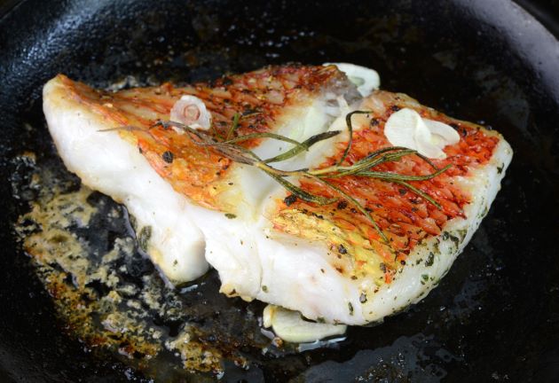 タキベラのポワレタキベラのポワレ 三枚に下ろして皮付きのまま塩コショウする。鍋につぶしたにんにく、多めのオリーブオイルを入れて香り出しをする。にんにくを取り出して、皮を下にして切り身入れて火を通す。このときフライ返しなどで押さえてふくらまないようにするといい。8分通り火が通ったら返して、一度取り出す。バルサミコと白ワインでデグラッセしてソースにする。