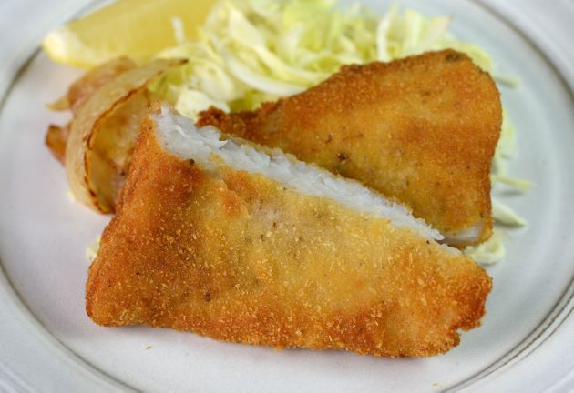 タキベラのフライ 非常に上質な白身で脂もあるので、熱を通しても硬く締まらない。筋肉内にうま味豊かなエキス分の存在を感じる。今回は短時間で火を通すためにフライにしてみた。三枚に下ろして皮を引き切身にする。塩コショウして小麦粉をまぶし溶き卵をくぐらせ、パン粉をつけてやや高温で揚げる。身が豊潤で味があり、非常に美味。