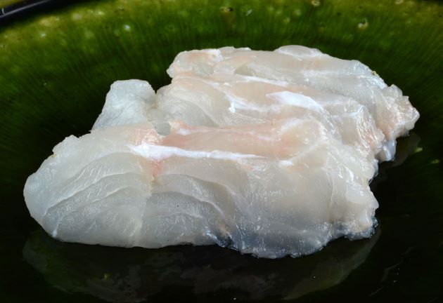タレクチベラの刺身 ベラ科らしく水分の多い身質で柔らかい。噛みしめると表面的には軟らかさを感じるが、適度な食感があり、まろやかな甘味が浮かび上がってくる。実に上品でイヤミのない味わい。ついつい箸が伸びてしまう味である。このふくらみのある、ほどよいうま味の感じられる白身はタイ科などにはないものだと思う。