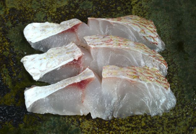 チダイの刺身 晩春から初夏と秋の個体は脂がのっている。ここでは身本来の味を楽しむべく、刺身にする。水洗いして三枚に下ろす。腹骨・血合い骨を取り、皮を引き刺身にする。皮下だけではなく全体に脂が混在して、舌に当たったとたん口溶け感が感じられる。クリックで閉じます![]()