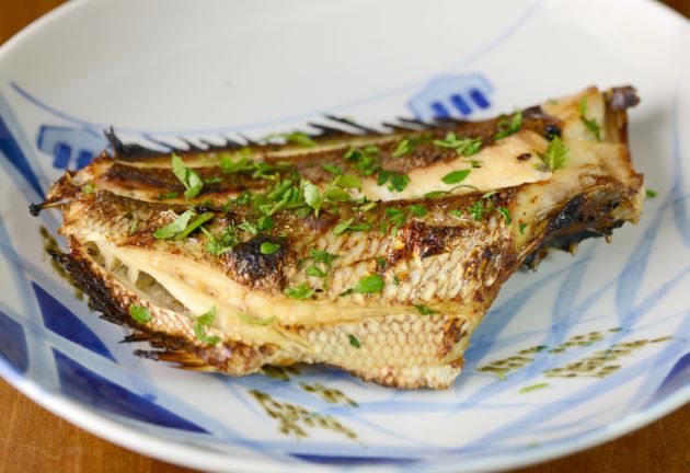 水洗いして、小振りのものは丸のままで、大きいものは切り身にする。振り塩をして少し寝かせる(できれば30分以上)、これをじっくりと焼き上げる。焼いても硬くならず、皮目に独特の甘味がある。身質がいいので身離れもいい。