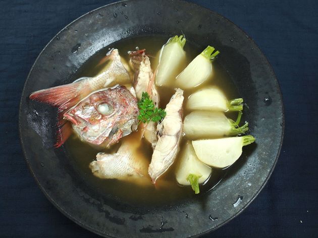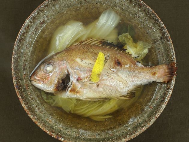 焼き鯛と白菜の汁だくさん煮 チダイは振り塩をして冷凍保存してもいいが、素焼きにして冷凍保存するのがいちばんいい。この素焼きを昆布だしで煮て、同じ煮汁で白菜などの野菜を煮る。煮汁と白菜、タイを同時に食す。クリックで閉じます![]()