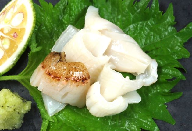 砂のついたただの石灰質の筒にしか思えない不思議な姿であり、一見生物とは思えないと思う。ようく根元の部分を見ると、二枚貝(貝殻)がへばりついているように見えるが、これがこの大きな物体の生体とも思えないだろう。この貝殻の下に軟体が隠れている。食用にはなるが全体の大きさに比べるとあまりにも小さい。