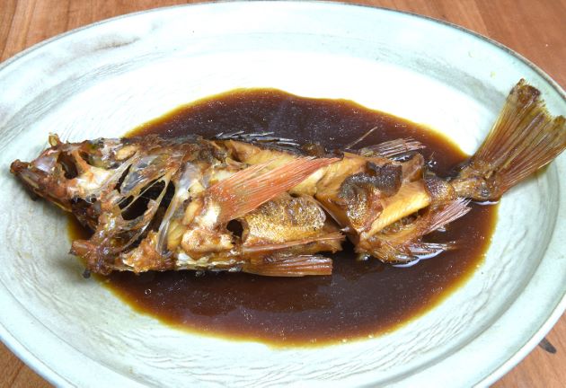 トゴットメバルの煮つけ あっさり味(メバルの煮つけ) 古くからずーっと煮つけ用の魚であった。定番的になるくらい煮つけはうまい。水洗いして一度水分をよく切り、湯通しして冷水に落として残った鱗やぬめりを流す。水分をよくきり、酒・醤油・水で煮る。みりんを加えてもいい。鮮度がいいと皮がはじける。身は適度に繊維質で煮ても軟らかく、身自体の持つうま味が豊かである。
