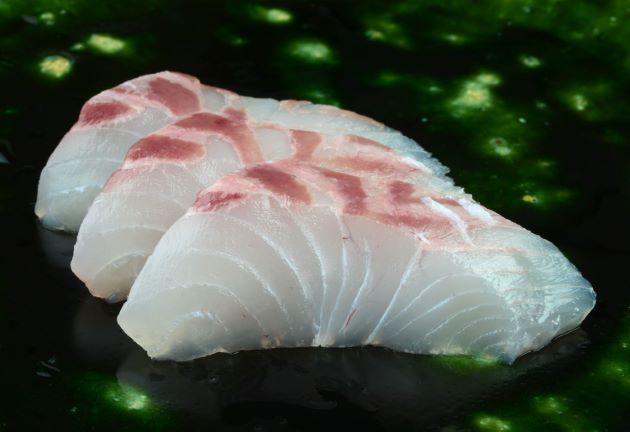 ナガテングハギモドキの刺身 水洗いする。皮を剥き、三枚に下ろして薄皮をひき、刺身状に切る。血合いはやや濃いものの、見た目にもきれい。ニザダイ科特有の臭味もなく、身に甘みがあり、魚らしいうま味も豊かである。野締めではあってもこのレベルなら活魚や活け締めはもっと味がいいかも。