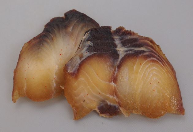 ねこざめなます 水洗いしたナヌカザメを丸のまま湯引き、鱗をこそげ落として適宜に切り落としたもの。これを辛子酢みそで食べる。湯引きの加減がよく臭味はなく、うま味が感じられて食感も心地よい。とても味がいい。市販のものであるが志摩地方での本種の利用法が見えてくる。[小川商店 三重県志摩市]クリックで閉じますねこざめなます