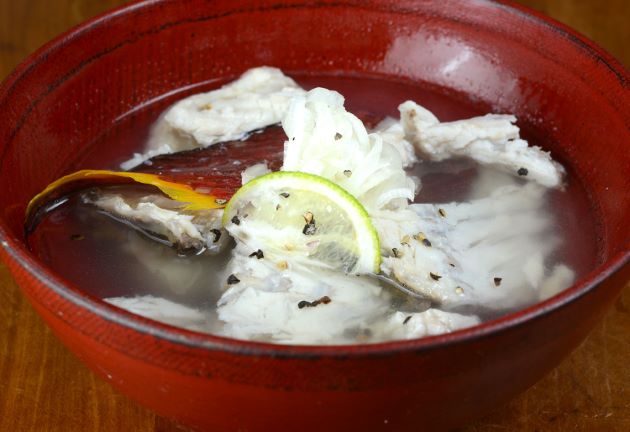 バラハタの潮汁 頭部や中骨を取って置く。適当に切り、湯通しして冷水に落として表面のぬめりと鱗を流す。水分をよくきり、昆布だしで煮だしてみそを溶く。ここでは柑橘類をしぼり、粗挽き黒コショウを散らした。クリックで閉じます![]()