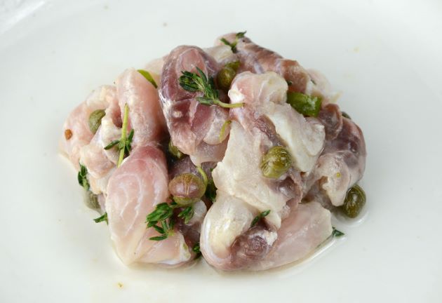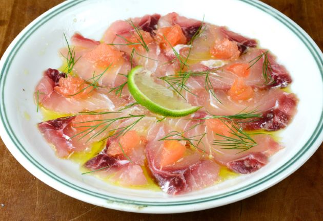 三枚に下ろして刺身にしたときの余りなどを集めて細かく切る。塩をまぶして、1時間以上置き、ライム果汁を加える。ハーブやケーパーなどを加えて和える。