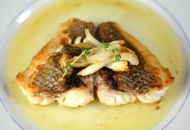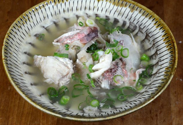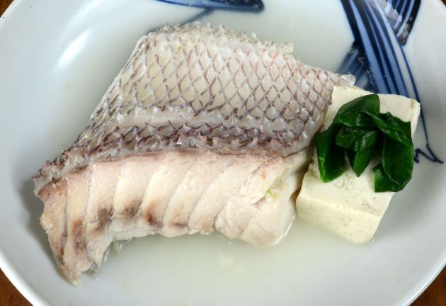 ここでは三枚に下ろし、腹骨周りの身を使った。これを強めの塩水の中で、強火で煮上げる。5分程度煮えたら豆腐を加え、終いに青みを加えて出来上がり。