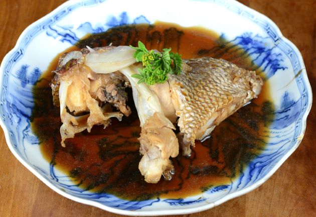 水洗いしてカマの部分を切り出す。湯通しして冷水に落とし、残った鱗やヌメリを流す。水分をきり、酒・砂糖・醤油・水、しょうがで煮る。