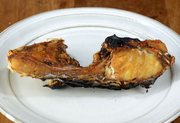 バラヒメダイの煮つけ カマの部分で骨も多いが身も多い。身を掘り出して食べるとほどよく繊維質で、舌の上で容易にほぐれる。身に甘味があって非常にうまい。クリックで閉じます![]()