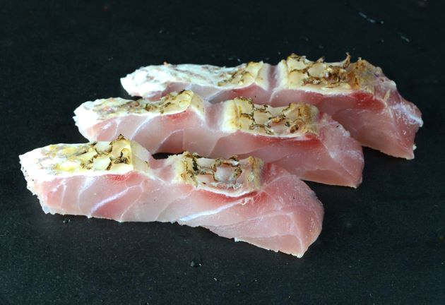 三枚に下ろして皮を引き、できるだけ薄く切りつける。皿にすり下ろしたにんにくとオリーブオイル、塩をしき、身を並べて行き、上からも振り塩をしオリーブオイルをたらす。