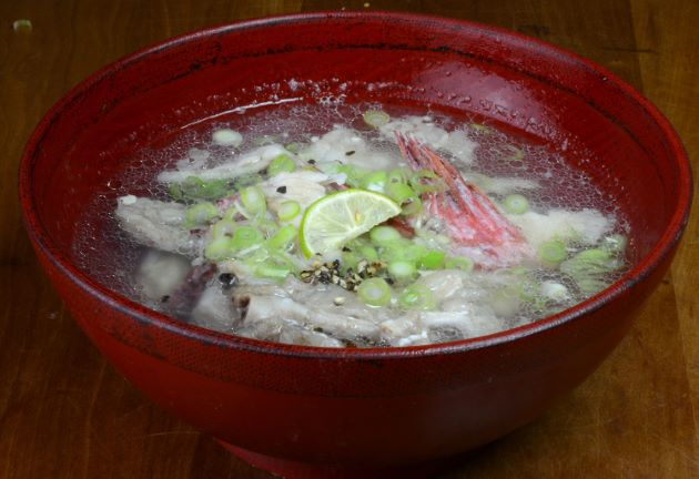 ヒレグロメヌケの潮汁 あらや鰭際、中骨などを集めて湯通しする。冷水に落として残った鱗やぬめりを流す。これを昆布だしで煮だして酒・塩で味つけする。濃厚でいながら後味のいい上質の汁になる。みそ味にしてもいい。クリックで閉じます![]()