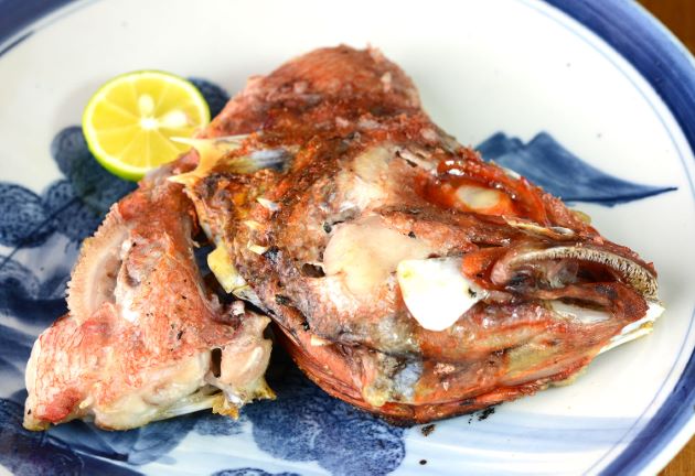 ヒレグロメヌケの塩焼き 焼いても硬くならず、筋肉・皮周辺がとてもジューシーでゼラチン質に富んでいる。ここではカマの部分に振り塩をして1時間以上寝かせてじっくりと焼き上げた。皮の香ばしさと、ゼラチン質の食感、身の甘さが感じられてとても味わい深い。クリックで閉じます![]()