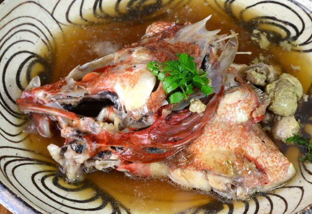 ヒレグロメヌケの煮つけ 頭部、かま下などと肝、胃袋などを集めて置く。切身使ってもいいが、大型なのであらを使った方が合理的だ。湯通しして、冷水に落として残った鱗やぬめりを流す。これを酒・しょうゆ・水で煮る。みりん、砂糖を使ってもいい。要するに煮つけは好みに仕立てるのがいいのだ。皮も身も柔らかく、どことなく脂の存在を感じる。非常に味わい深い。