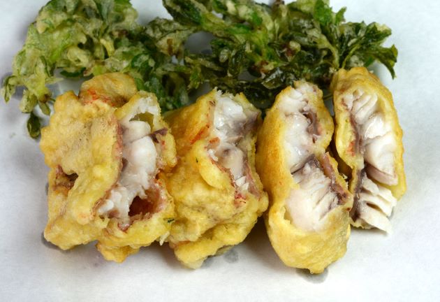 ヒレグロメヌケの天ぷら 身(筋肉)は筋繊維があまり感じられず、スポンジのようで網目状の中に脂が混在している。切り身にして小麦粉をまぶして衣をつける。高温で揚げる。身はふんわりとふくらんで中に空洞ができ、食べると豊潤で甘みがある。実にうまい。クリックで閉じます![]()