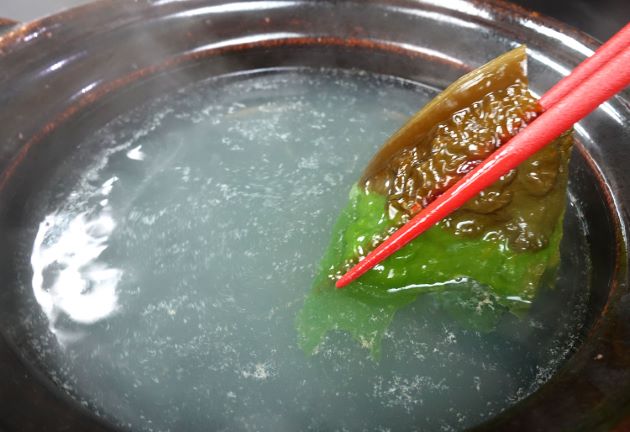 ヒロメのしゃぶしゃぶ ここではカツオ節だしに酒・塩で味つけしたが、醤油をつかってもなんでもいい。韓国風に煮干しだしでもおいしい。ここではカツオ節出しに酒・塩で味つけし、ざっと水洗いして適当に切ったものを、好みの熱の通し方で食べる。